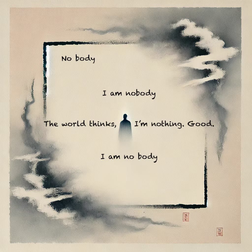 No body I am nobody The world thinks, I’m nothing. Good. I am no body