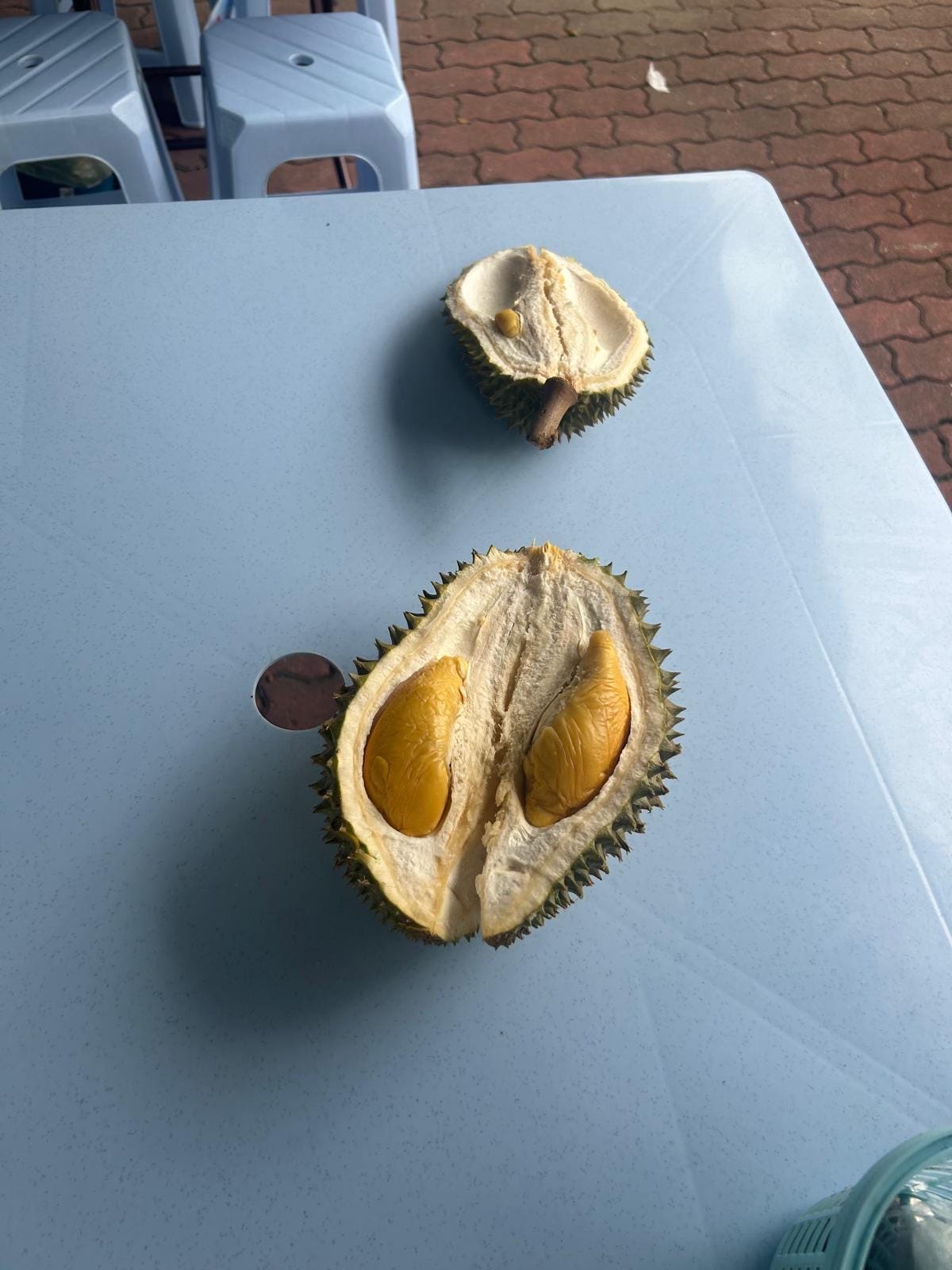 We also tried durian for the first time. It’s known to be a pretty divisive fruit, and I landed firmly in the “not my thing” camp. The flavor was… interesting. Not terrible, but it tasted like a savory soup that was disguised as a fruit, and the texture didn’t help: a thin outer film layer covering a goopy mush. Plus, when entire buildings have “no durians allowed” signs, and they hand you plastic gloves to wear while you eat, it doesn’t scream, “This is delicious!”