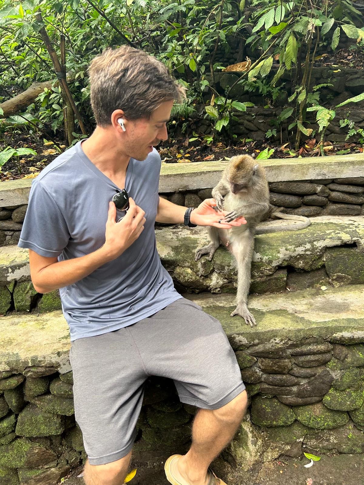 We also visited a legitimate monkey sanctuary in the center of Bali. These monkeys were even bolder than the ones in KL. When we walked in, I watched a monkey steal a coffee from a tourist, drink it, and then throw the cup and walk casually onto my shoulder. Then, thinking I was all hot stuff—the monkey whisperer, the chosen one—I interacted a bit more with other monkeys than I probably should have. They are, after all, still wild animals.