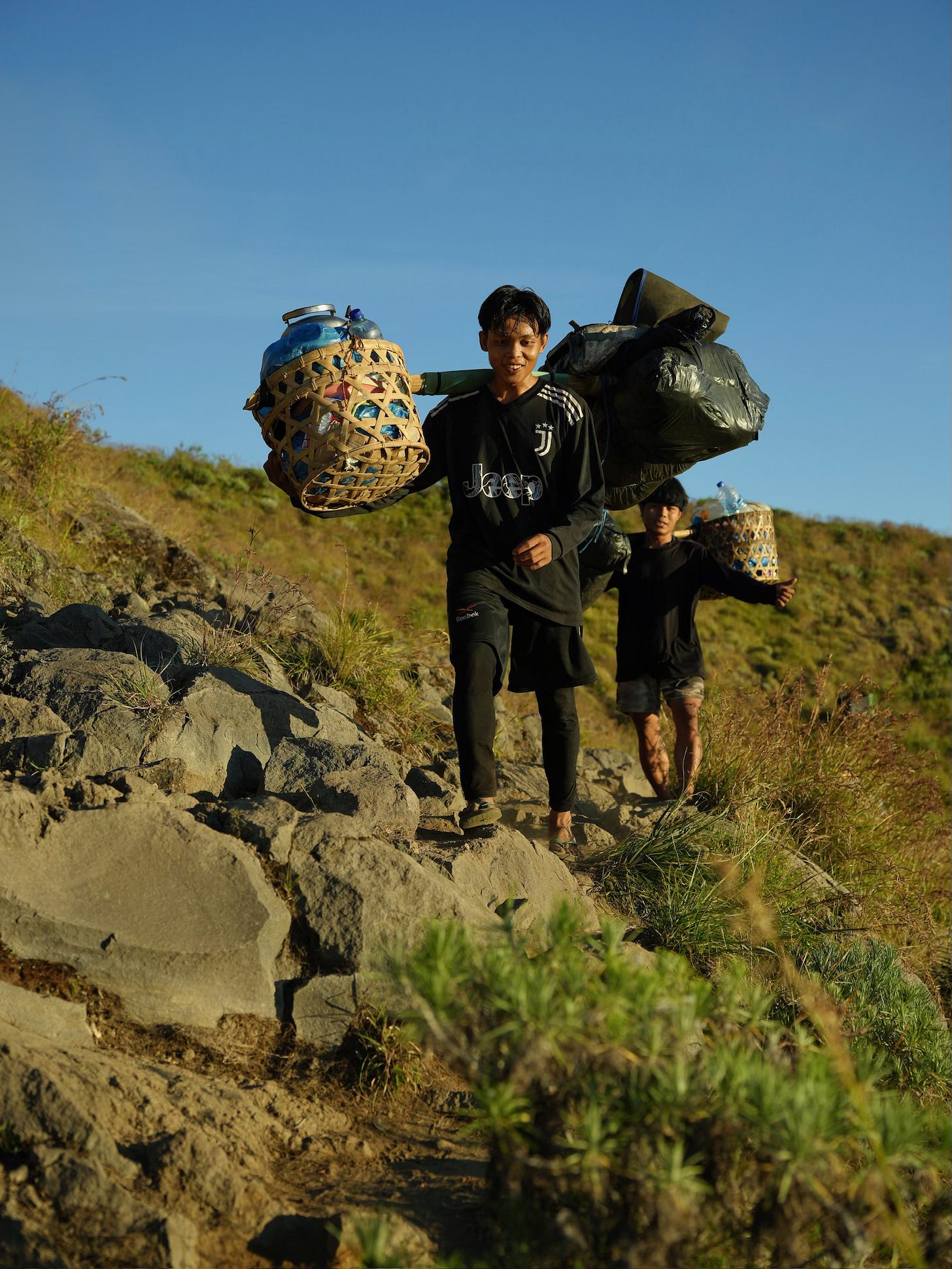 Later that morning, we descended to the crater lake and soaked in hot springs—a welcome reset for sore legs—and then continued the long, dusty journey back down (and up, and down, and up) the mountain. The guides, meanwhile, did the hike in flip-flops, carrying supplies on bamboo poles like it was a casual stroll.